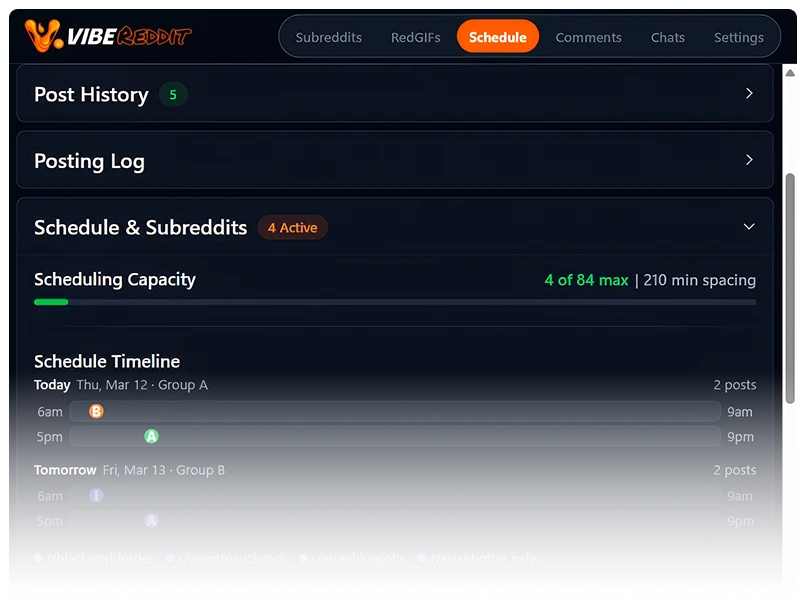 Schedule RedGIFs to subreddits with AI-generated titles. Posts go live on your schedule—no manual submit, no babysitting.